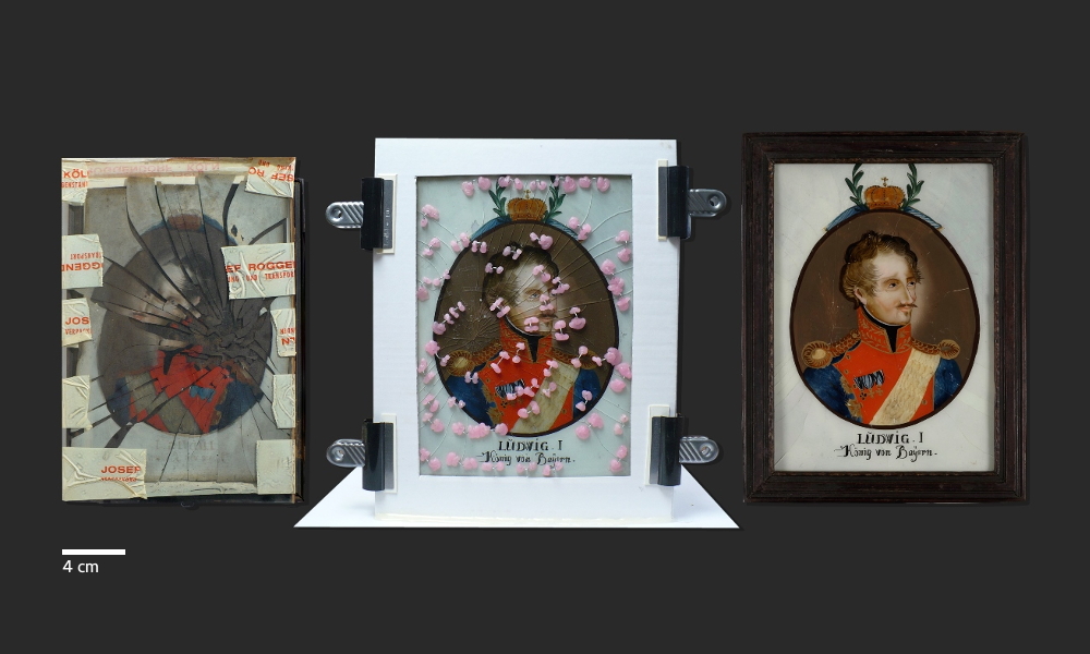 Hinterglasmalerei Porträt Ludwig I., König von Bayern. Reinigung des Objektes, Festigung loser Malschichten, Sicherung und Klebung der Scherben, Retusche von Fehlstellen. Vorzustand, Zwischenzustand, Nachzustand.Abbildung mit freundlicher Genehmigung des Historischen Museums der Pfalz Speyer, Inv.-Nr. B.S.2574, Foto: Melanie Konrad, 2009.