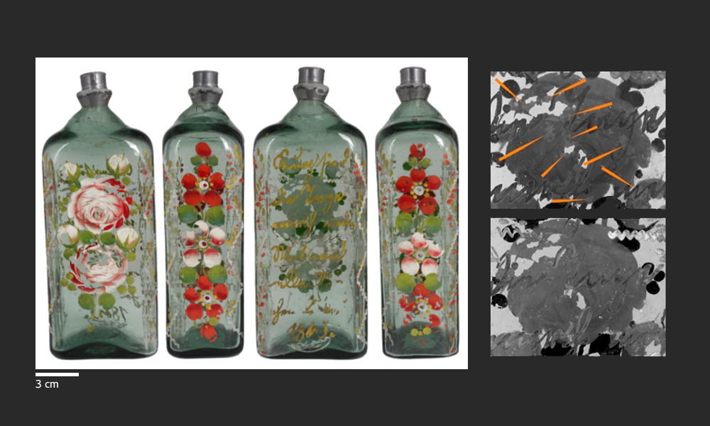Schnapsflasche der Sammlung Spiegelhalder, Glas mit Kaltmalerei, Aufschrift „Kurz sind die Tage mir hienieden weil mich alle Mädchen lieben. 1865“. Reinigung der Oberfläche und Festigung loser Malschichten. Vier Ansichten der Flasche im Nachzustand, Detailaufnahme partiell loser Malschichten in Graustufen im Vor- und Nachzustand: Ungefestigte, vom Glasträger abstehende Bereiche schimmern hell, hier: orange markiert.Abbildung mit freundlicher Genehmigung des Franziskanermuseums Villingen-Schwenningen, Inv.-Nr. 7401, Foto: Melanie Konrad, 2013.