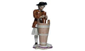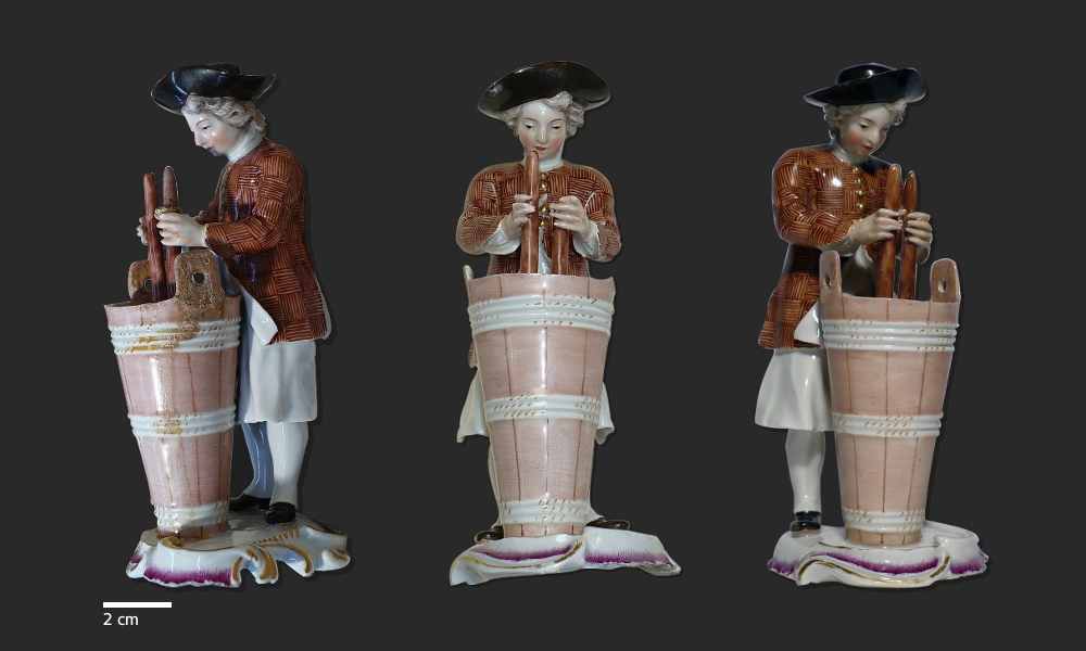 Winzerfigur aus der Frankenthaler Porzellanmanufaktur. Reinigung, Abnahme gealterter Sicherungsmaterialien, Neuverklebung, Ergänzung von Fehlstellen, Retusche. Drei Ansichten im Nachzustand.Abbildung mit freundlicher Genehmigung des Historischen Museums der Pfalz Speyer, Inv.-Nr. HM 1927/23, Foto: Melanie Konrad, 2009.
