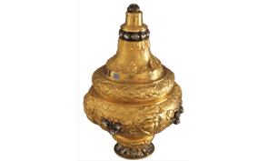 Zierkanne aus Stein und vergoldetem Silber. Reinigung der Oberfläche, Korrosionsabtrag. Vorzustand, Nachzustand. Eigentum des Landesmuseums Württemberg, Inv.-Nr. KK grün 133. Abbildung mit freundlicher Genehmigung des Eigentümers, Foto: Lucie Selb & Melanie Konrad GbR, 2015.
