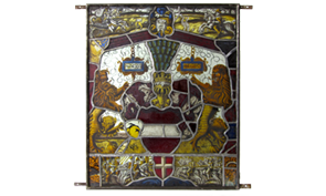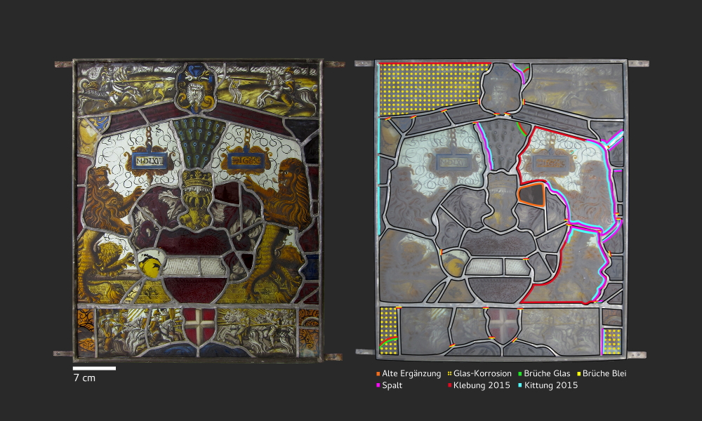 Kabinettscheibe „Wappenscheibe“, 16. Jh. Reinigung der Oberfläche, Klebung gebrochener Bleiruten und Glasscheiben, Klebung und Verfüllung offener Fugen zwischen Glas und Bleiruten. Nachzustand, Kartierung von Vorzustand und Maßnahmen.Abbildung mit freundlicher Genehmigung des Franziskanermuseums Villingen-Schwenningen, Inv.-Nr. 11858, Foto: Lucie Selb & Melanie Konrad GbR, 2015.