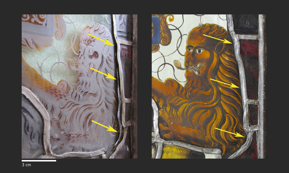 Kabinettscheibe „Wappenscheibe“, 16. Jh. Klebung und Verfüllung offener Fugen zwischen Glas und Bleiruten. Detailaufnahme im Vor- und Nachzustand.Abbildung mit freundlicher Genehmigung des Franziskanermuseums Villingen-Schwenningen, Inv.-Nr. 11858, Foto: Lucie Selb & Melanie Konrad GbR, 2015.