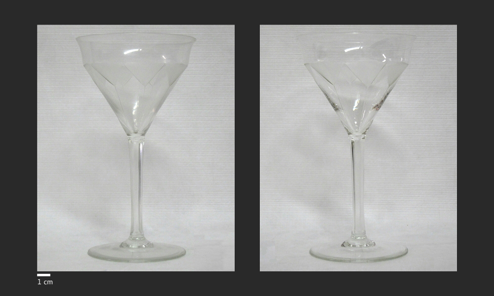 Kelchglas. Reinigung der Oberfläche zur Verringerung des Fortschreitens der Glaskorrosion. Vorzustand, Nachzustand. Eigentum des Landesmuseums Württemberg, Inv.-Nr. 1986-275. Abbildung mit freundlicher Genehmigung des Eigentümers, Foto: Lucie Selb & Melanie Konrad GbR, 2015.