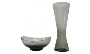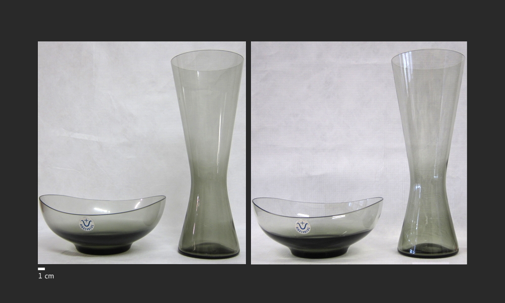 Kristallglas, Topas, von Wilhelm Braun-Feldweg, Kristallwerk Hirschberg, 1950er-Jahre. Reinigung der Oberfläche zur Verringerung des Fortschreitens der Glaskorrosion. Vorzustand, Nachzustand. Eigentum des Landesmuseums Württemberg, Inv.-Nr. N 2417 und 1991-488. Abbildung mit freundlicher Genehmigung des Eigentümers, Foto: Lucie Selb & Melanie Konrad GbR, 2015.