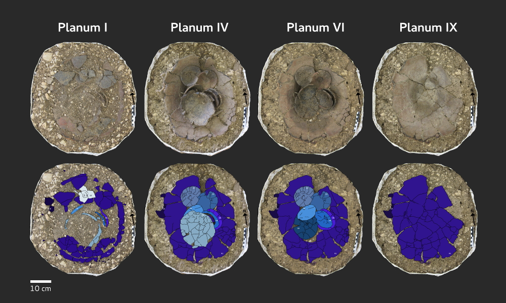 Urnengrab aus Kirchheim unter Teck, Urnenfelderzeit, Grabung 2015, Blockbergung. Dokumentation und Freilegung der Blockbergung in Plana. Bilddokumentation mit Kartierung der Fragmente der einzelnen Keramikgefäße. Abbildung mit freundlicher Genehmigung des Städtischen Museums im Kornhaus, Kirchheim unter Teck, Foto: Lucie Selb & Melanie Konrad GbR, 2016.