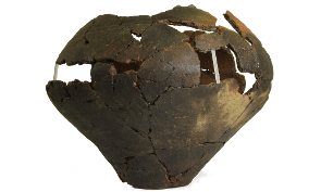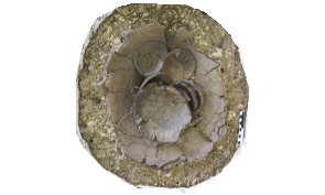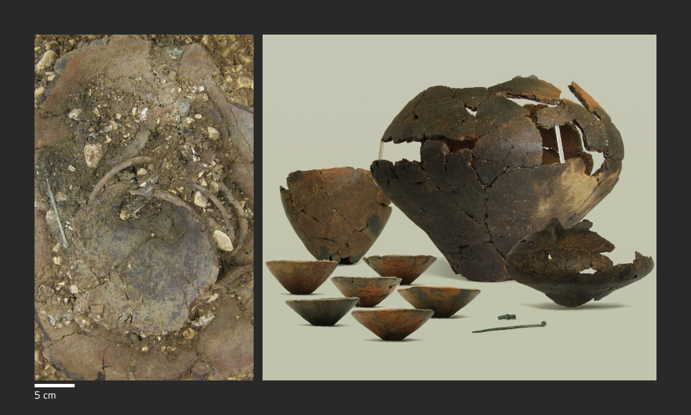 Urnengrab aus Kirchheim unter Teck, Urnenfelderzeit, Grabung 2015, Blockbergung. Dokumentation und Freilegung der Blockbergung in Plana, Reinigung, Klebung, Sicherung und Konservierung der Objekte. Detailaufnahme der Blockbergung während der Freilegung, Abbildung der Urne und Grabbeigaben im Nachzustand.Abbildung mit freundlicher Genehmigung des Städtischen Museums im Kornhaus, Kirchheim unter Teck, Foto: Lucie Selb & Melanie Konrad GbR, 2016.