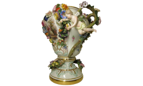 Korpus einer Potpourrivase aus der Porzellanmanufaktur Meissen. Reinigung der Oberfläche, Abtrag von gealterten Retuschen, Ergänzung des fehlenden Beines des schwebenden Putto, Retusche von Fehlstellen. Vorzustand, Detailaufnahme während der Reinigung, Nachzustand. Eigentum der Städtischen Museen Heilbronn, Meissener Prunkvase (Duftvase/Potpourri), Meissen 1850-1880, Slg. Becker-Franck, Inv.-Nr. 9218A/07. Abbildung mit freundlicher Genehmigung des Eigentümers, Foto: Lucie Selb & Melanie Konrad GbR, 2016.