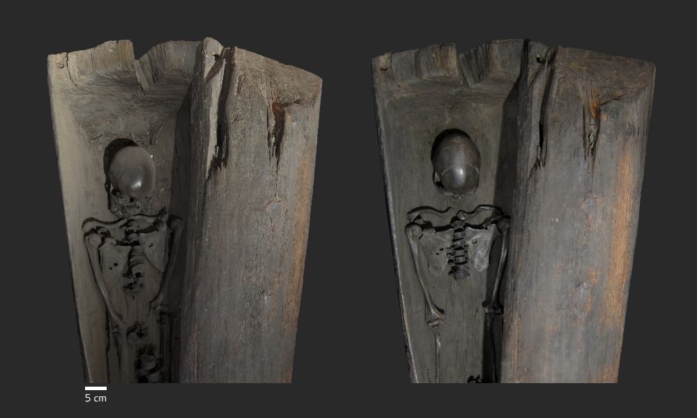 Baumsarg aus Oberflacht (Kreis Tuttlingen) mit Skelett und Spatha, 6. Jh., Grabung 1892. Reinigung der Oberfläche, Beseitigung von Staubauflagen und Schmutzanhaftungen, partielle Festigung des Holzes und Klebung von Brüchen. Detailaufnahme des geöffneten Sarges und der Sargdeckelaußenseite im Vor- und Nachzustand.Abbildung mit freundlicher Genehmigung des Museums im Ritterhaus, Offenburg, Inv.-Nr. OF Grab 82, Foto: Lucie Selb & Melanie Konrad GbR, 2016.
