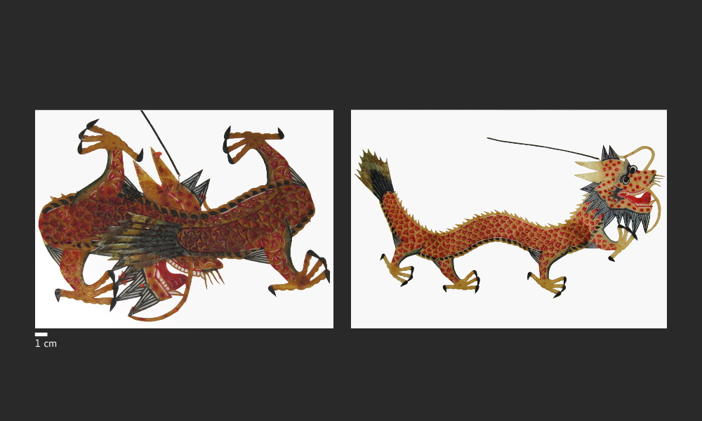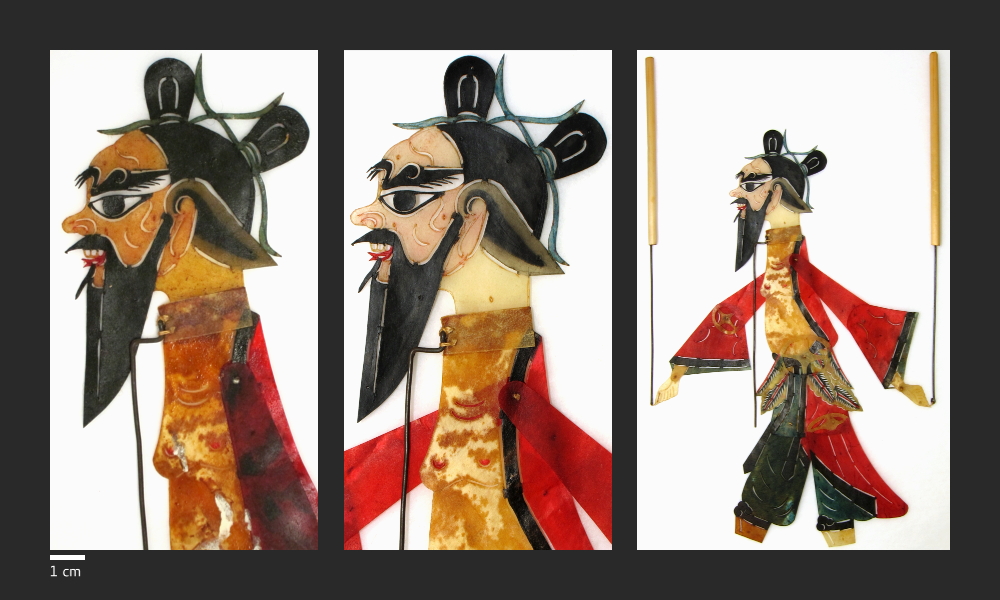 Chinesische Schattenspielfigur aus Pergament. Reinigung der Oberfläche, Abtrag einer historischen Fettung und Lösen der einhergehenden Verklebung der beweglichen Glieder. Detailaufnahme im Vor- und Nachzustand, Gesamtaufnahme im Nachzustand. Privatbesitz, Abbildung mit freundlicher Genehmigung des Eigentümers, Foto: Lucie Selb & Melanie Konrad GbR, 2016.