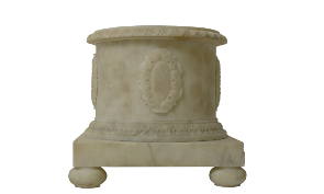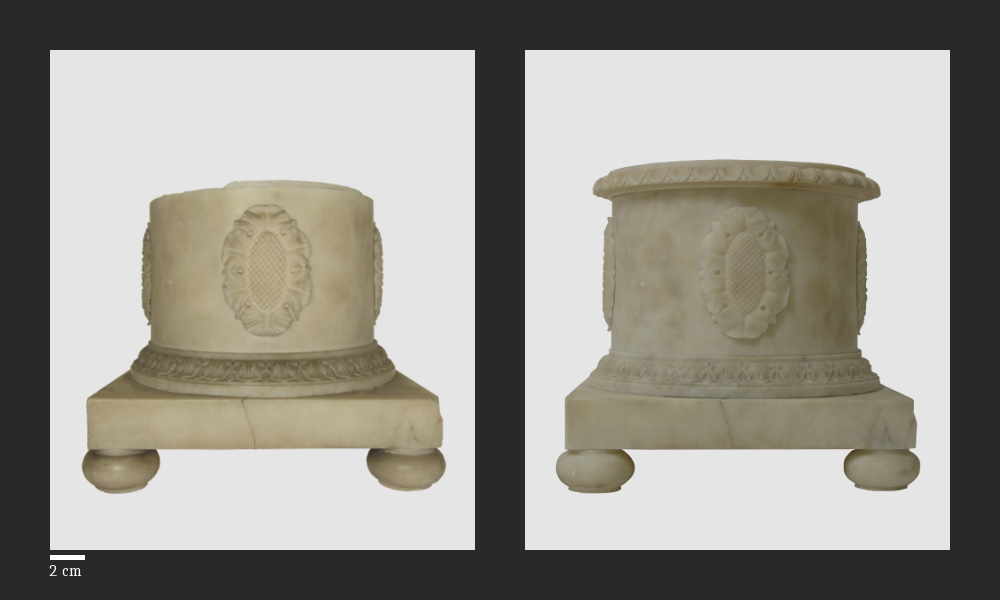 Sockel einer Figurengruppe aus Alabastergips. Reinigung der Oberfläche, Abnahme aufliegender Verschmutzungen, Reduzierung von Verfärbungen, Wiederbefestigung der Zierleiste. Vor- und Nachzustand des Sockels.Abbildung mit freundlicher Genehmigung der Staatlichen Schlösser und Gärten Baden-Württemberg, Inv.-Nr. G1617, Foto: Lucie Selb & Melanie Konrad GbR, 2016.