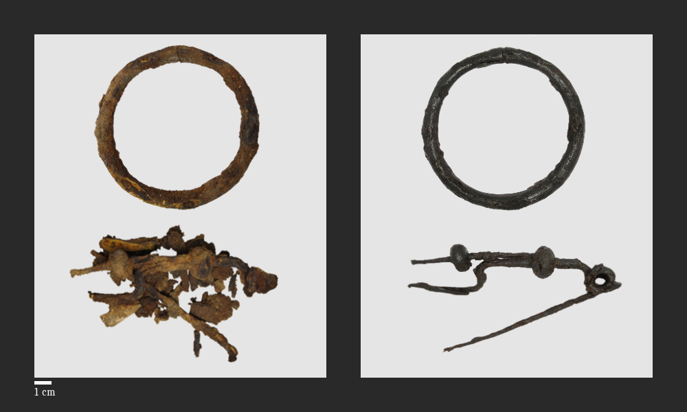 Keltische Grabbeigaben aus Eisen, Reif, Fibel, Bergung 1949. Eisenentsalzung und Bearbeitung der Funde für Präsentationszwecke. Vorzustand, Nachzustand. Abbildung mit freundlicher Genehmigung des Badischen Landesmuseums Karlsruhe, Inv.-Nr. 2016/25 und 2016/26, Foto: Lucie Selb & Melanie Konrad GbR, 2016/ 2017.