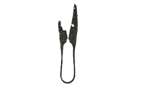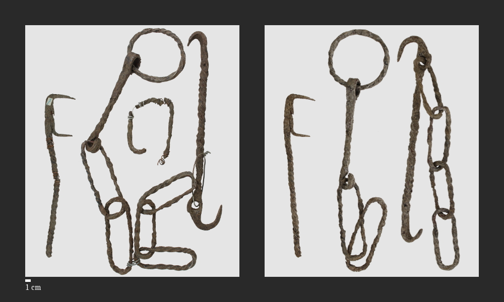 "Fleischgabel" und Kesselgehänge, Eisen, tordiert, Bergung 1926-1929, Burgruine Lützelhardt, Grabung Karl Hammel. Abnahme vorliegender Konservierungsmittel, Eisenentsalzung, Klebung von Brüchen und partielle Stabilitätsergänzung. Vorzustand, Nachzustand. Abbildung mit freundlicher Genehmigung der Gemeinde Seelbach, Dr. Heiko Wagner und Dr. Niklot Krohn, Inv. Nr. H72/256 und H72/258, Foto: Lucie Selb & Melanie Konrad GbR, 2019.