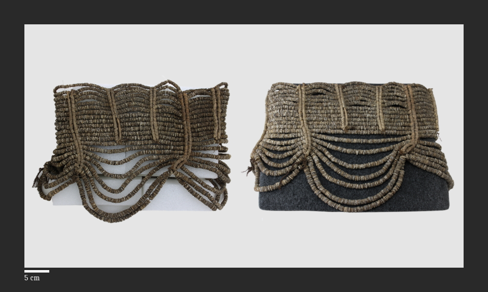 Brustschmuck aus Afrika, Straußeneierschalen, Leder, Pflanzenfasern. Reinigung des Objektes und Anfertigung einer formunterstützenden Aufbewahrungs- und Präsentationshilfe. Vorzustand, Nachzustand.Abbildung mit freundlicher Genehmigung des Museums im Ritterhaus, Offenburg, Inv.-Nr. OF2528a, Foto: Lucie Selb & Melanie Konrad GbR, 2019.