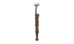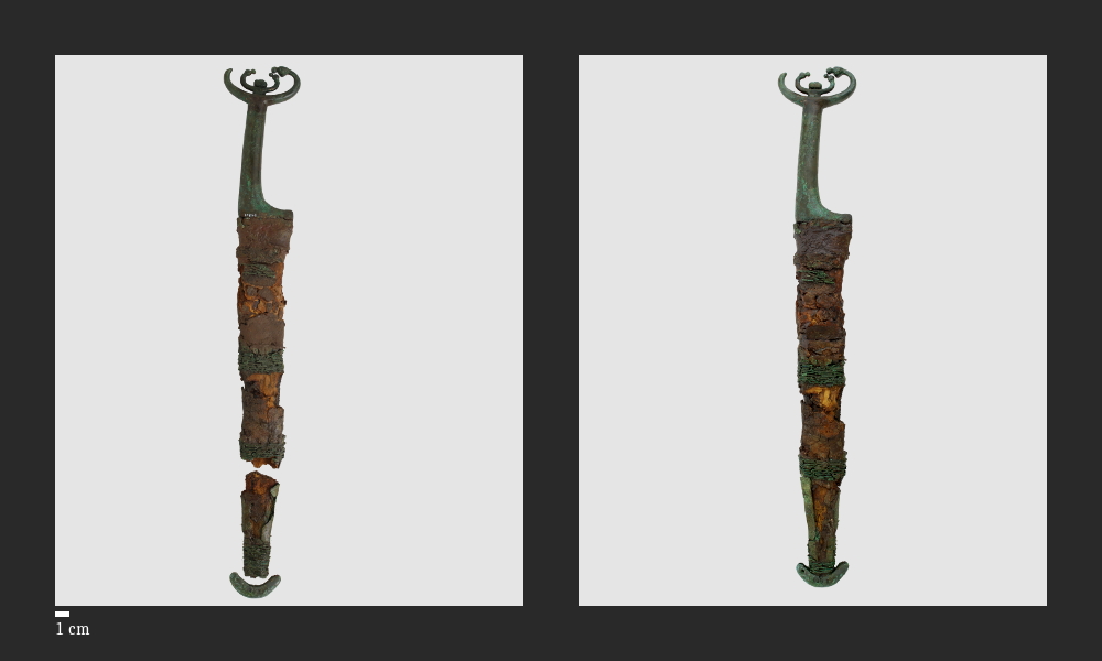 Dolch mit Scheide, Eisen, Kupferlegierung, organisches Material. Überarbeitung der Altrestaurierung und Objektsicherung. Vorzustand, Nachzustand. Abbildung mit freundlicher Genehmigung des Badischen Landesmuseums Karlsruhe, Inv.-Nr. C9858, Foto: Lucie Selb & Melanie Konrad GbR, 2018/ 2019.