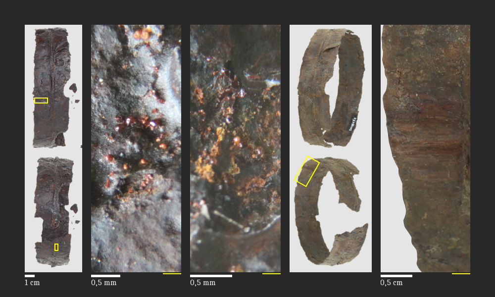 Deichelring mit Holzanhaftungen, Eisen, Bergung 1985. Abnahme vorliegender Konservierungsmittel, Eisenentsalzung und Bearbeitung für Präsentationszwecke. Vorzustand mit Mikroskopaufnahmen: orangebraune Bläschen „weeping iron" und Abplatzungen der Oberfläche weisen auf eine Belastung mit Chloriden und ein Fortschreiten der Korrosion hin, Nachzustand mit Detailaufnahme: partielle Holzanhaftung. Abbildung mit freundlicher Genehmigung des Badischen Landesmuseums Karlsruhe, Inv.-Nr. C2018/172, Foto: Lucie Selb & Melanie Konrad GbR, 2018/ 2019.