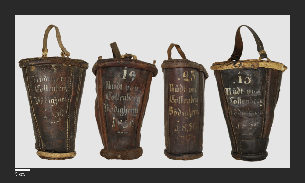 Löscheimer aus Leder, Aufschrift „Rüdt von Collenberg Bödigheim 1850“. Konditionierung der Materialfeuchte, Reinigung der Oberfläche, Festigung der historischen Beschriftung, Sicherung von Nähten und einzelnen Rissen. Nachzustand.Abbildung mit freundlicher Genehmigung des Vereins Bezirksmuseum e.V. Buchen, Inv.-Nr. 6356, 7138, 7139 und 7140, Foto: Lucie Selb & Melanie Konrad GbR, 2018.