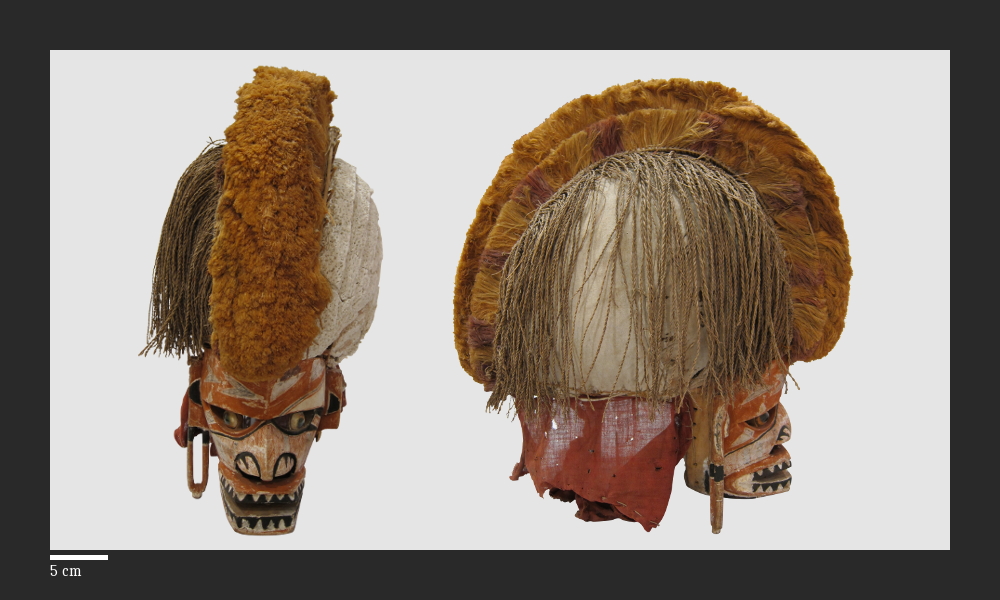 Maske aus der Südsee, pflanzliche Materialien, Farbfassung, Gips, Glas. Reinigungsmaßnahmen. Nachzustand.Abbildung mit freundlicher Genehmigung des Museums im Ritterhaus, Offenburg, Inv.-Nr. OF2631, Foto: Lucie Selb & Melanie Konrad GbR, 2017.