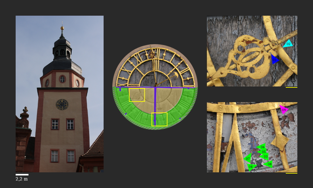 Turmuhren des Rathauses Ettlingen. Bestandsaufnahme, Schadensdokumentation und Erstellung eines Leistungsverzeichnisses sowie Betreuung der Maßnahmen. Gesamtaufnahme im Nachzustand, Kartierung und Detailaufnahmen im Vorzustand.Abbildung mit freundlicher Genehmigung der Stadt Ettlingen, Amt für Hochbau und Gebäudewirtschaft, Foto: Lucie Selb & Melanie Konrad GbR, 2017/ 2018.