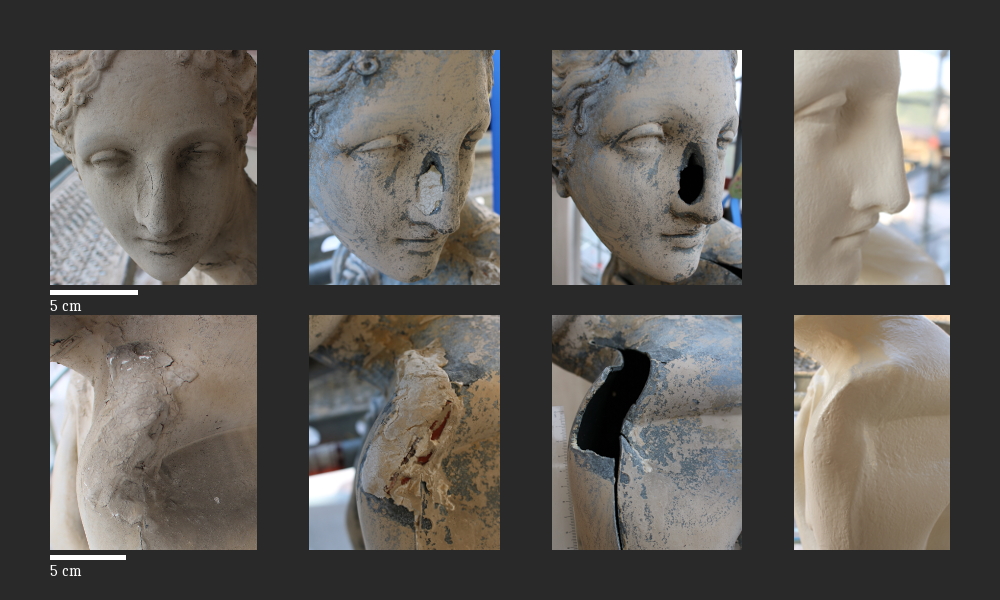 Frauenfiguren der Rotunde des Vierordtbades Karlsruhe, Zinkguss mit Farbfassung, um 1872. Reinigung der Oberfläche, Festigung anhaftender Farbschichten, Abnahme gealterter Ergänzungsmaterialien, Schließung von Fehlstellen, Beschichtung der Oberfläche. Detailaufnahmen im Vor-, Zwischen- und Nachzustand.Abbildung mit freundlicher Genehmigung der Stadt Karlsruhe, Bäderbetriebe und des Architekturbüros Behrens, Landau, Foto: Lucie Selb & Melanie Konrad GbR, 2018/ 2019.