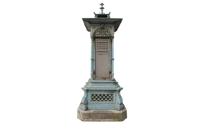 Wettersäule Karlsruhe, Eisenguss mit Farbfassung, Mitte 19. Jh., Eisengießerei Johann Friedrich Mack, Frankfurt am Main. Bestandsaufnahme, Schadensdokumentation und Erstellung eines Maßnahmenkatalogs. Westansicht der Wettersäule im Vorzustand, Detailaufnahme, Kartierung.Abbildung mit freundlicher Genehmigung der Stadt Karlsruhe, Gartenbauamt, Foto: Lucie Selb & Melanie Konrad GbR, 2017.