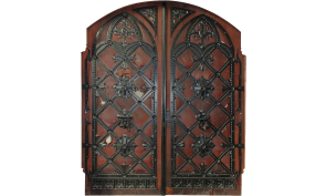 Gruft-Türe der Großherzoglichen Grabkapelle Karlsruhe, Holz, Leder und Schmiedeeisen, um 1890. Bestandsaufnahme, Schadenanalyse und Maßnahmenkonzept zur Erhaltung der Lederbespannung. Abbildung mit freundlicher Genehmigung der Staatlichen Schlösser und Gärten Baden-Württemberg, Foto: Lucie Selb & Melanie Konrad GbR, 2020.