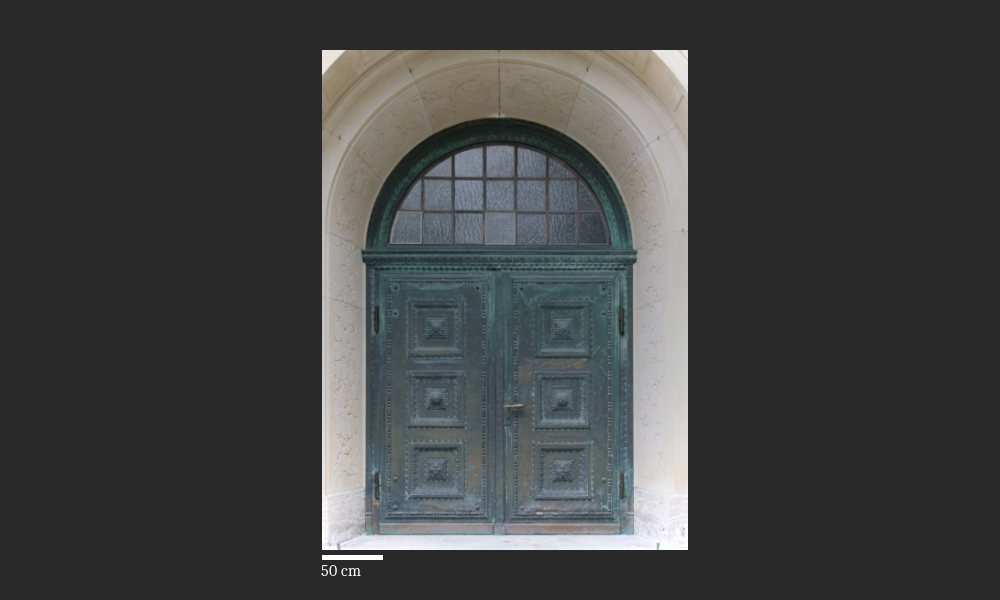 Portaltüre der Christuskirche Pforzheim, Holz, Kupferblech, um 1910. Reinigung der Portaltüren, Sicherung und Ergänzung von Zierelementen, Konservierung. Gesamtaufnahme Nordportal im Nachzustand. Abbildung mit freundlicher Genehmigung der Christuskirche Pforzheim, Vermögen und Bau Baden-Württemberg, Amt Pforzheim und des Architekturbüros Behrens, Landau, Foto: Lucie Selb & Melanie Konrad GbR, 2021.