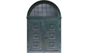 Portaltüre der Katholischen Kirchenstiftung St. Michael, Dannstadt-Schauernheim, Holz, Kupferblech. Reinigung der Portaltüren, Abnahme von Beschriftungen und Klebestreifenanhaftungen, Konservierung. Gesamtaufnahme Nord-Westportal im Vor- und Nachzustand. Abbildung mit freundlicher Genehmigung der Katholischen Kirchengemeinde Hl. Sebastian, des Bistums Speyer und des Architekturbüros Behrens, Landau, Foto: Lucie Selb & Melanie Konrad GbR, 2021.