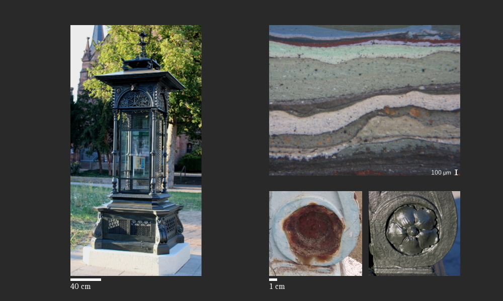 Wettersäule Karlsruhe, Eisenguss mit Farbfassung, Betonsockel, Mitte 19. Jh.. Reinigung und Neufassung der Oberfläche, Fassungsuntersuchung, Ergänzung von Fehlstellen. Südansicht der Wettersäule im Nachzustand, Querschliff der Fassungsschichten, Detailaufnahme einer Fehlstelle im Vor- und Nachzustand. Abbildung mit freundlicher Genehmigung der Stadt Karlsruhe, Gartenbauamt, Foto: Lucie Selb & Melanie Konrad GbR, 2020.