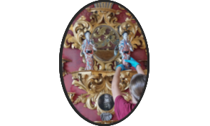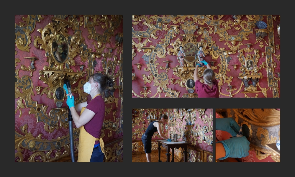 Ausstellungsaufbau im Spiegel- und Porzellankabinett in Schloss Weikersheim. Reinigung der Konsolen und sonstigen Raumausstattung, Reinigung des ostasiatisches Porzellans und diverser Kunstgegenstände, Neubestückung des Kabinetts. Abbildung mit freundlicher Genehmigung der Staatlichen Schlösser und Gärten Baden-Württemberg, Foto: Veronika Nuding, Staatliche Schlösser und Gärten Baden-Württemberg, 2022.