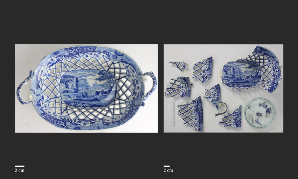Teller, Porzellan mit Aufglasurmalerei, 19. Jh.. Reinigung, Klebung, Ergänzung. Vor- und Nachzustand. Privatbesitz, Abbildung mit freundlicher Genehmigung des Eigentümers, Foto: Lucie Selb & Melanie Konrad GbR, 2023.