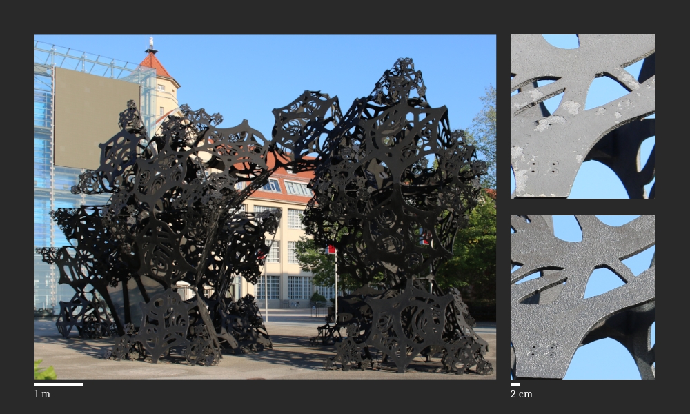Hier ein kurzer Filmbeitrag zu unserem Projekt.Matthew Ritchie, »The Morning Line«, 2008. Klang- und Videoinstallation auf dem Vorplatz des ZKM | Zentrum für Kunst und Medien Karlsruhe, entworfen von Matthew Ritchie in Zusammenarbeit mit den Architekten ArandaLasch und Arup AGU, Stahl, Aluminium, Kunststoffe, Farbfassung. Reinigung, Korrosionsschutz, Ergänzung von Fehlstellen in der Farbfassung. Süd-Ostansicht im Nachzustand, Detailaufnahme von Vor- und Nachzustand. © Matthew Ritchie, mit freundlicher Genehmigung des ZKM | Zentrum für Kunst und Medien Karlsruhe, Foto: Lucie Selb & Melanie Konrad GbR, 2022.