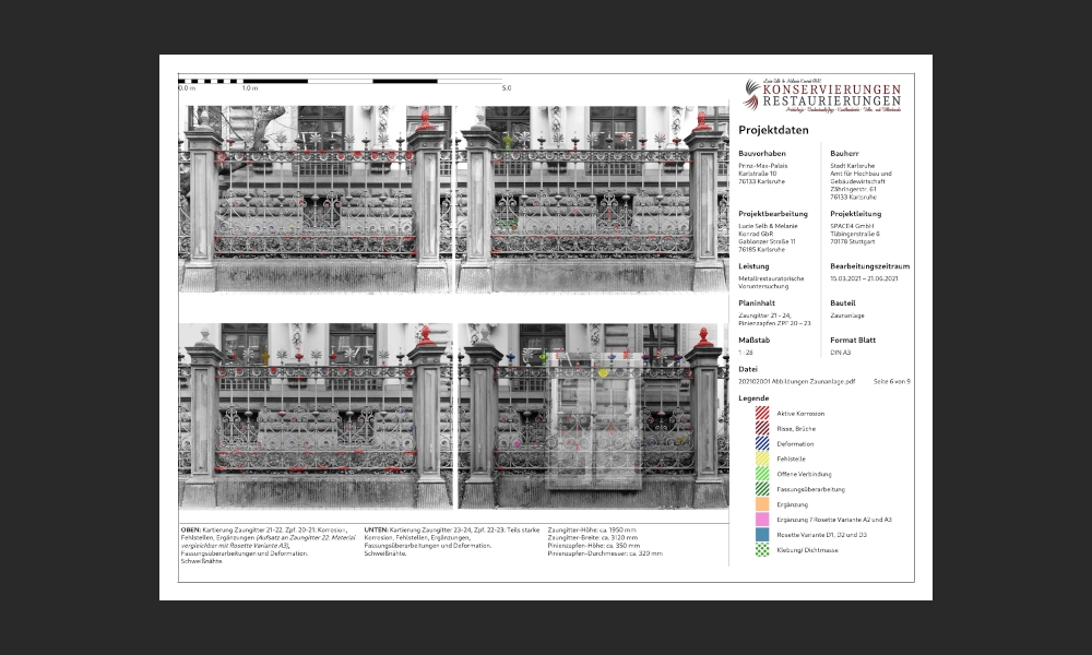 Zaungitter der Zaunanlage des Prinz-Max-Palais, Karlsruhe, Guss- und Walzeisen, 19. Jh.. Untersuchung der Metallausstattung, Erstellung eines Maßnahmenkonzeptes. Ausschnitt aus der Dokumentation der Zaunanlage, Kartierung von vier Zaunelementen. Abbildung mit freundlicher Genehmigung der Stadt Karlsruhe, Amt für Hochbau und Gebäudewirtschaft und der SPACE4 GmbH, Suttgart, Foto: Lucie Selb & Melanie Konrad GbR, 2021.