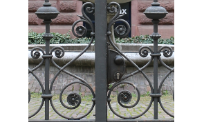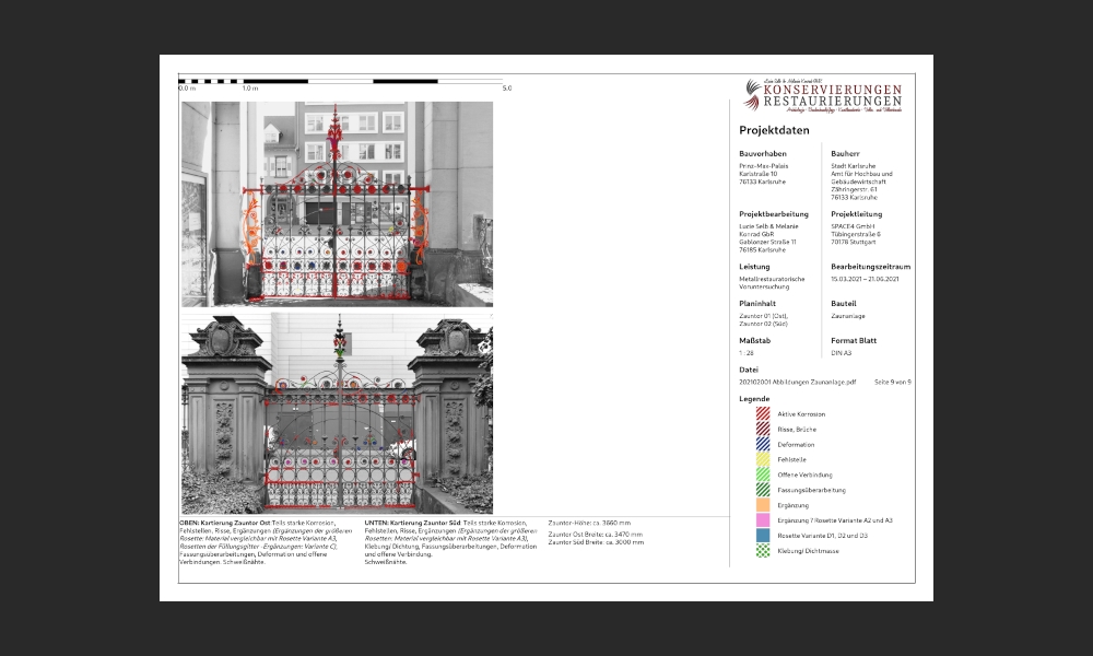 Zauntore der Zaunanlage des Prinz-Max-Palais, Karlsruhe, Guss- und Walzeisen, 19. Jh.. Kartierung von Bestand und Zustand, Erstellung eines Maßnahmenkonzeptes. Ausschnitt aus der Dokumentation der Zaunanlage, Kartierung der beiden Zauntore. Abbildung mit freundlicher Genehmigung der Stadt Karlsruhe, Amt für Hochbau und Gebäudewirtschaft und der SPACE4 GmbH, Suttgart, Foto: Lucie Selb & Melanie Konrad GbR, 2021.