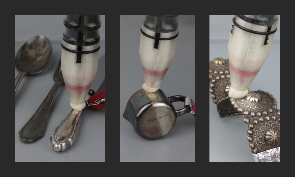 Silberobjekte, Besteck, Kännchen und Armreif, Silberlegierung. Lokale Reduktion von Anlaufschichten, Oberflächenreinigung mittels Elektrolysestift "Pleco" - entwickelt durch das fablab-neuch. Zwischenzustand der jeweiligen Objekte. Privatbesitz, Abbildung mit freundlicher Genehmigung des Eigentümers, Foto: Lucie Selb & Melanie Konrad GbR, 2023.