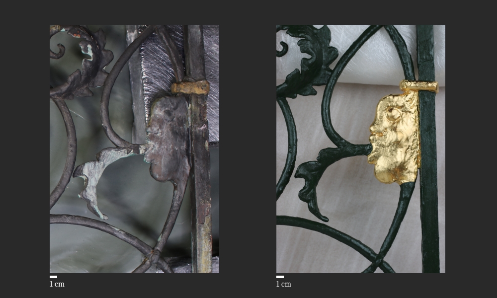 Wirtshausschild des Gasthauses "Zum Wilden Mann" aus Lörrach, Schmiedeeinsen, Farbfassung, Teilvergoldung, um 1830. Untersuchung und Sicherung historischer Schichten, Überarbeitung der Fassung in Orientierung am historischen Erscheinungsbild. Detailaufnahme im Vor- und Nachzustand. Abbildung mit freundlicher Genehmigung des Dreiländermuseums / Musée des Trois Pays Lörrach, Foto: Lucie Selb & Melanie Konrad GbR, 2022/ 2023.